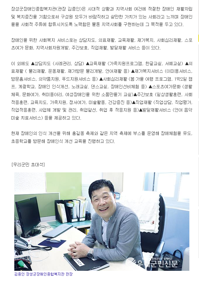 ◎ 기사명 : 장성군장애인종합복지관 김종인관장