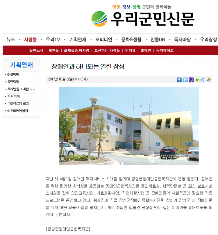 | 다음글 장성군민신문-<만나고싶었습니다> 장성군장애인종합복지관 김종인관장 |