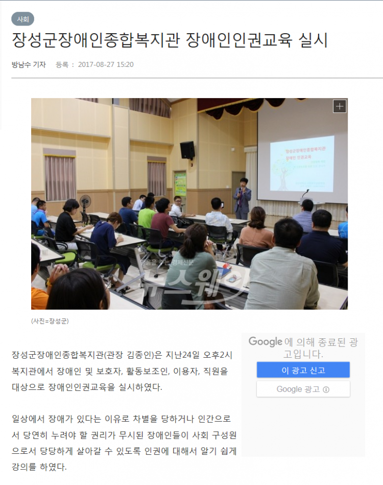 ◎ 기사명 : 장성군장애인종합복지관 장애인인권교육 실시