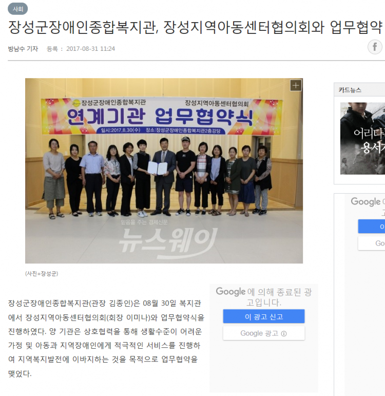 ◎ 기사명 : 장성군장애인종합복지관, 장성지역아동센터협의회와 업무협약