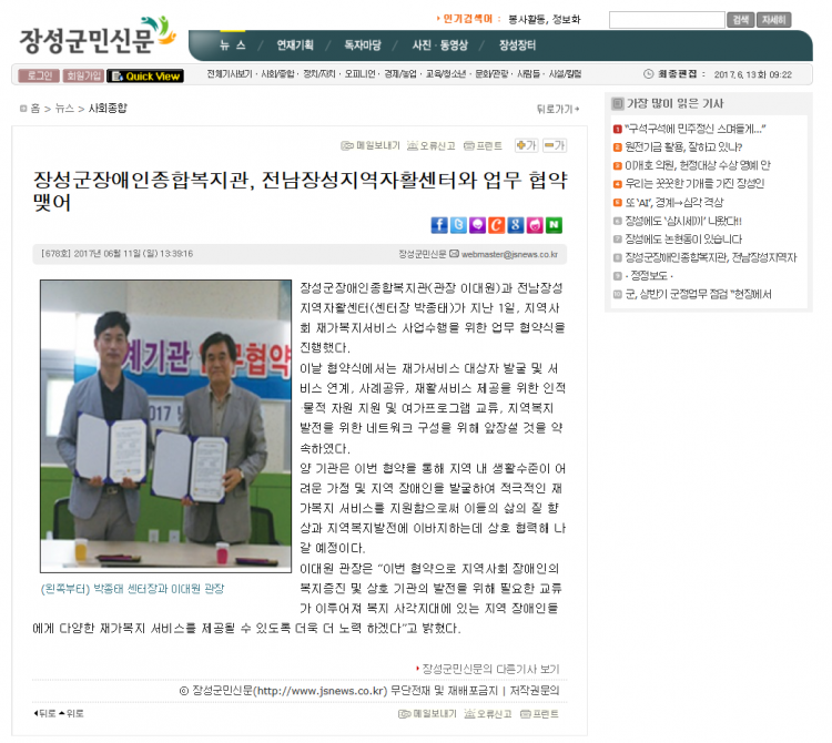 ◎ 기사명 : 장성군장애인종합복지관 전남장성지역자활센터와 업무 협약 맺어