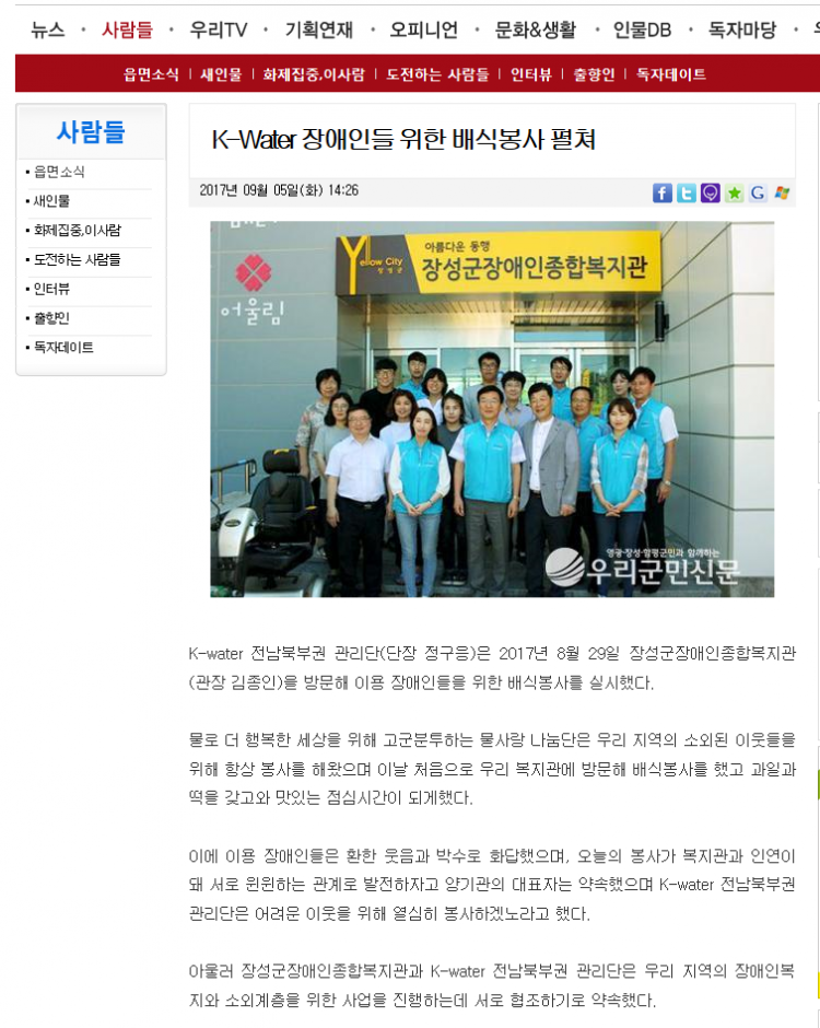 ◎ 기사명 : K-Water장애인들 위한 배식봉사 펼쳐
