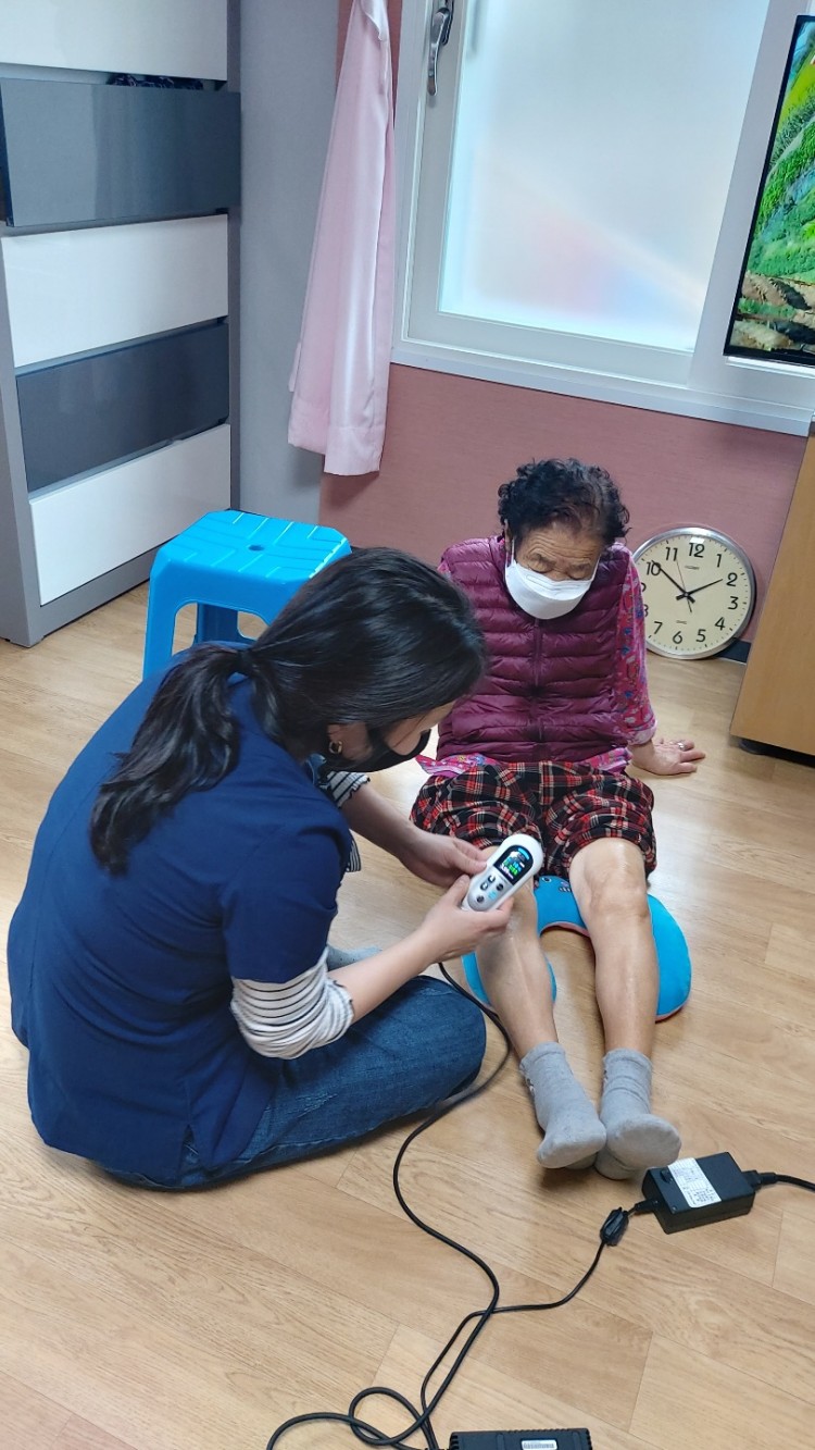 코로나 19 사회적 거리두기 1.5단계 시행에 따라 이동방문 물리재활 프로그램이 시작되었습니다. 이동에 어려움이 있는 이용자 가정을 방문하여 초음파를 시행하고 유착된 근육의 움직임을 증대하는 시간을 가졌습니다. 능동 보조 운동을 통해 통증이 감소 되어 더 건강해 질 수 있도록 하겠습니다.