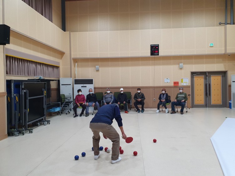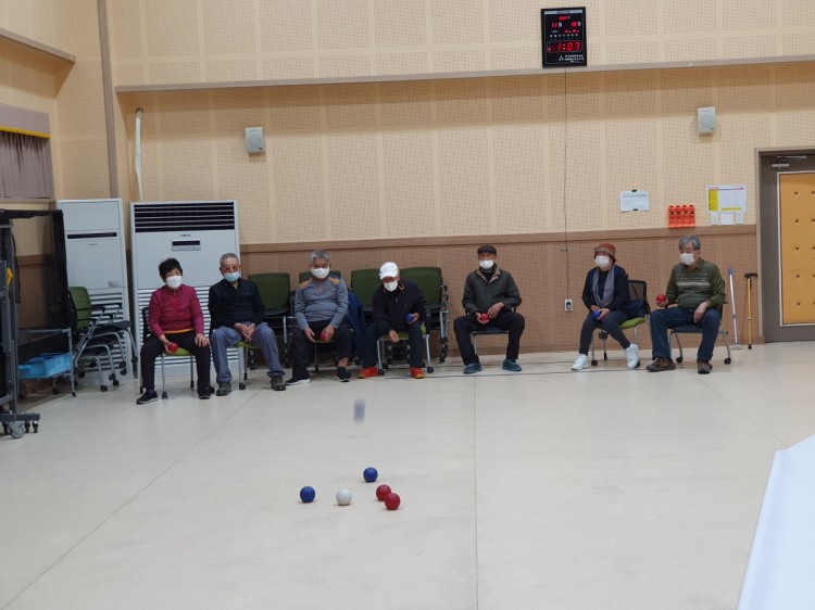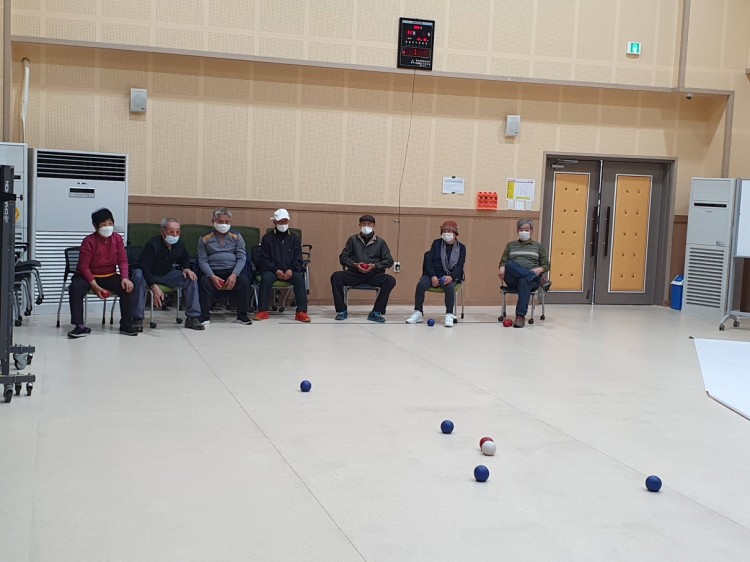 팀을 나누어 표적구에 가깝게 공을 던지는 보치아게임을 통해 신체활동을 높일수 있는 시간이 되었으며