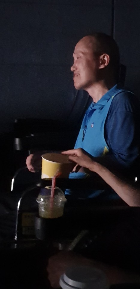 휠체어 장애 1급과 청각장애인이 함께 영화를 보고 스트레스를 풀고 계시는 모습,