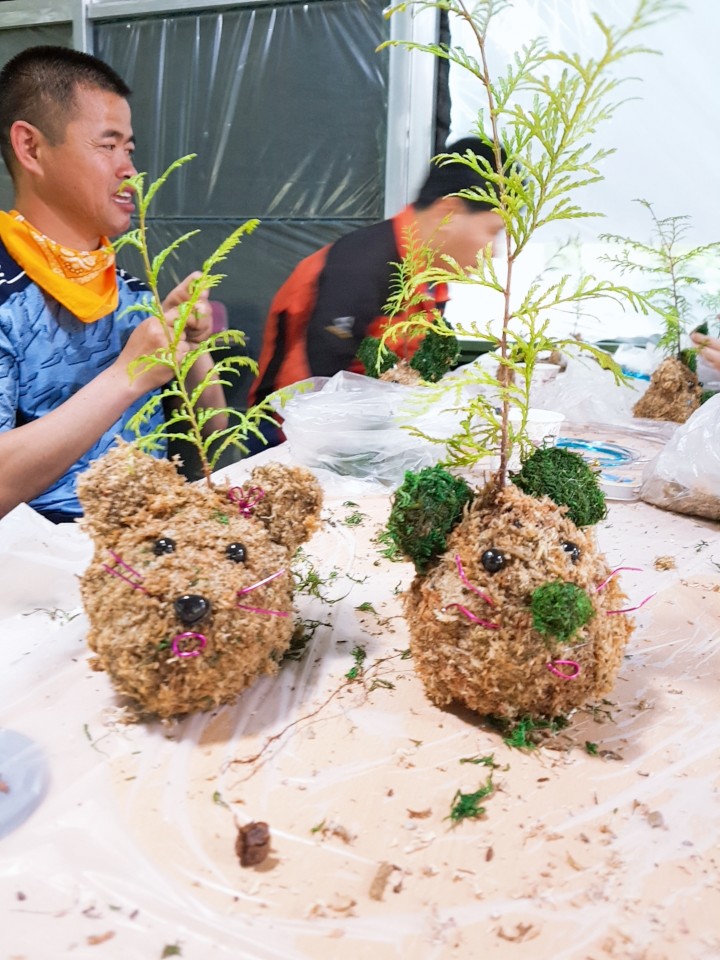 이끼로 편백묘목을 감싸 낚시줄로 단단히 고정시킨 후 꾸미기 재료, 이끼, 와이어를 이용하여 자신이 원하는 동물의 얼굴을 만들었습니다. 자신만의 개성을 살려 다양한 모양의 토피어리를 만들 수 있었습니다.