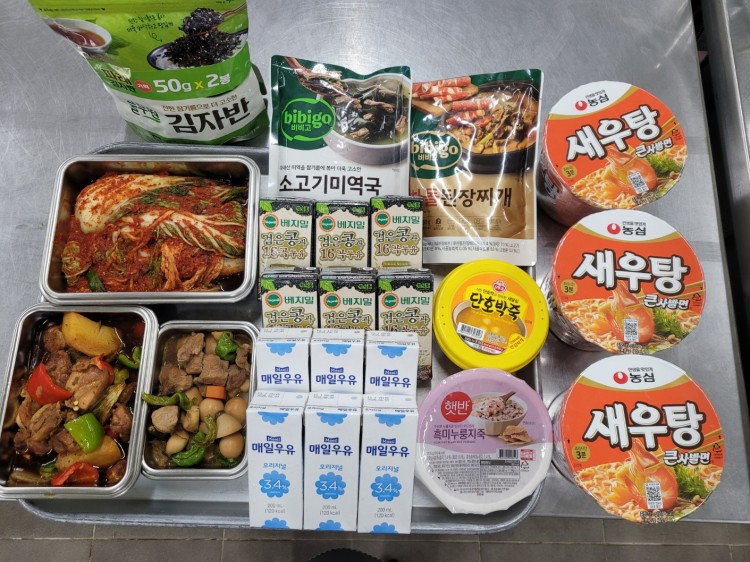 ● 15명: 안동찜닭, 돈육메알장조림, 배추김치, 쇠고기미역국 1ea, 차돌된장찌개 1ea(푸드뱅크), 단호박죽1ea, 흑미누룽지죽 1ea(푸드뱅크), 컵라면 1ea(3개입), 우유 6ea, 두유 6ea, 볶음자반 1ea