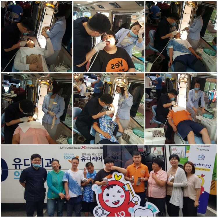 오늘 주간보호실 친구들은 한국농어촌공사가 주관하고 농림축산식품부가 주최한 농촌재능나눔대학생 캠프에 참여하였습니다. 황룡면에 위치한 오투스토리에서 진행되었으며, 다양한 체험 중 우리 친구들은 치과검진과 사진촬영을 하였습니다. 현재 치아 건강상태 및 치료할 치아에 대해서 자세한 설명을 들을 수 있었고, 즐거운 분위기 속에서 개인 사진촬영도 진행되었습니다. 촬영한 사진은 추 후에 액자에 예쁘게 담아 복지관으로 보내주기로 했습니다.