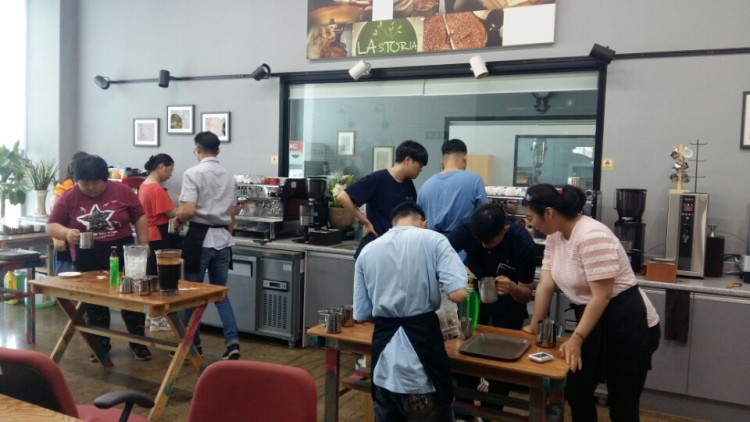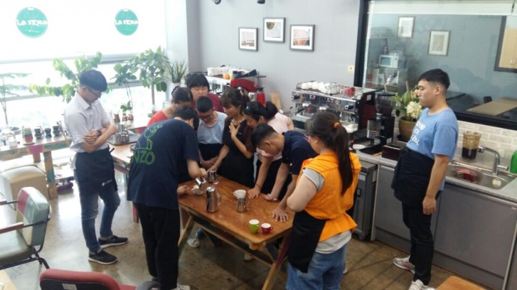 에스프레소 머신 2개의 그룹을 이용한 연속 추출하기를 반복 연습하였으며
