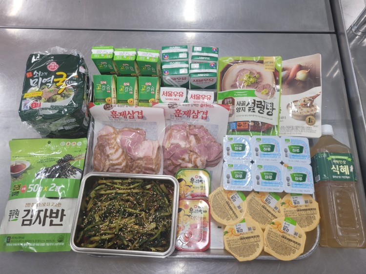 ● 15명: 훈제삼겹, 깻잎장아찌, 더덕장아찌, 열무김치, 사골양지설렁탕 1ea, 버섯야채죽1ea, 쇠고기미역국라면 (5개입), 우유 6ea, 두유 6ea, 자반 1ea, 밀감푸딩 5ea, 요거트6ea