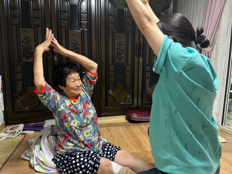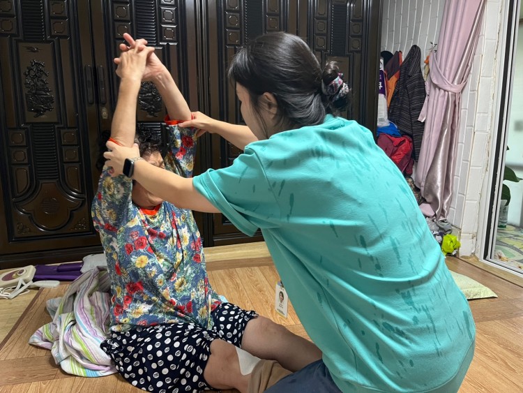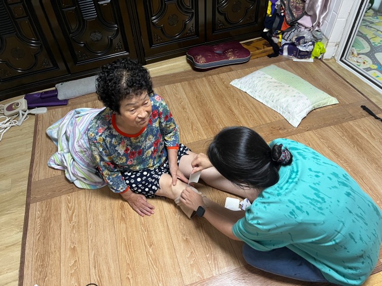 가정 내 환경을 점검한 결과, 다행히 비로 인한 누수나 침수는 발견되지 않았으나, 장마철 특유의 습한 날씨로 인해 모기의 증가로 생활에 불편이 크다는 호소가 있었습니다. 이날 물리재활은 어르신의 무릎 통증 완화와 관절의 기능 유지를 중심으로 이루어졌습니다. 통증 부위에는 파스를 적용하였고, 관절의 유연성을 높이기 위한 간단한 스트레칭과 능동·수동 운동을 함께 실시하였습니다. 더불어, 소도구를 활용한 상지 및 하지 운동을 통해 혈액순환을 도우며 신체 기능을 유지할 수 있도록 안내해드렸습니다.