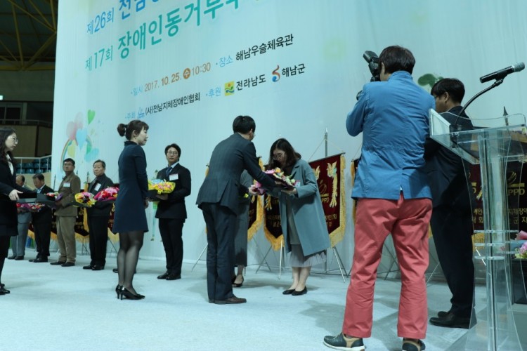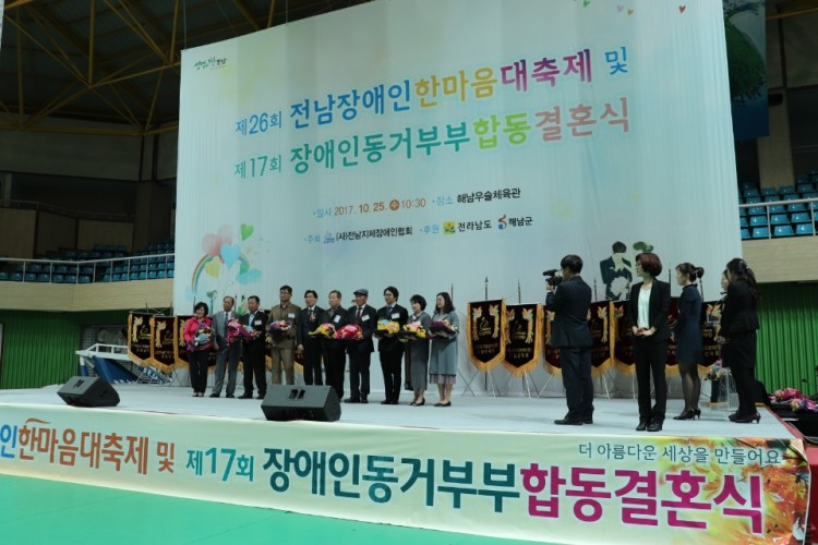 10월 25일(수) 해남우슬체육관에서는 (사)전남지체장애인협회에서 주최한 제26회 전남장애인한마음대축제 및 제17회 장애인동거부부합동결혼식이 진행되었습니다. 이날 행사는 장애인들의 화합을 도모하고 재활자립 의지를 고취시켜 사회참여 기회를 확대시키는 한편, 부부의 연으로 살고 있으면서 어려운 여건으로 결혼식을 올리지 못한 장애인 부부들의 화촉을 밝혀주어 행복한 가정을 도모하는 뜻에서 시행된 뜻 깊은 자리였습니다. 이날 행사에서는 장성군장애인종합복지관 김해인선생님이 도지사표창을 받았습니다.