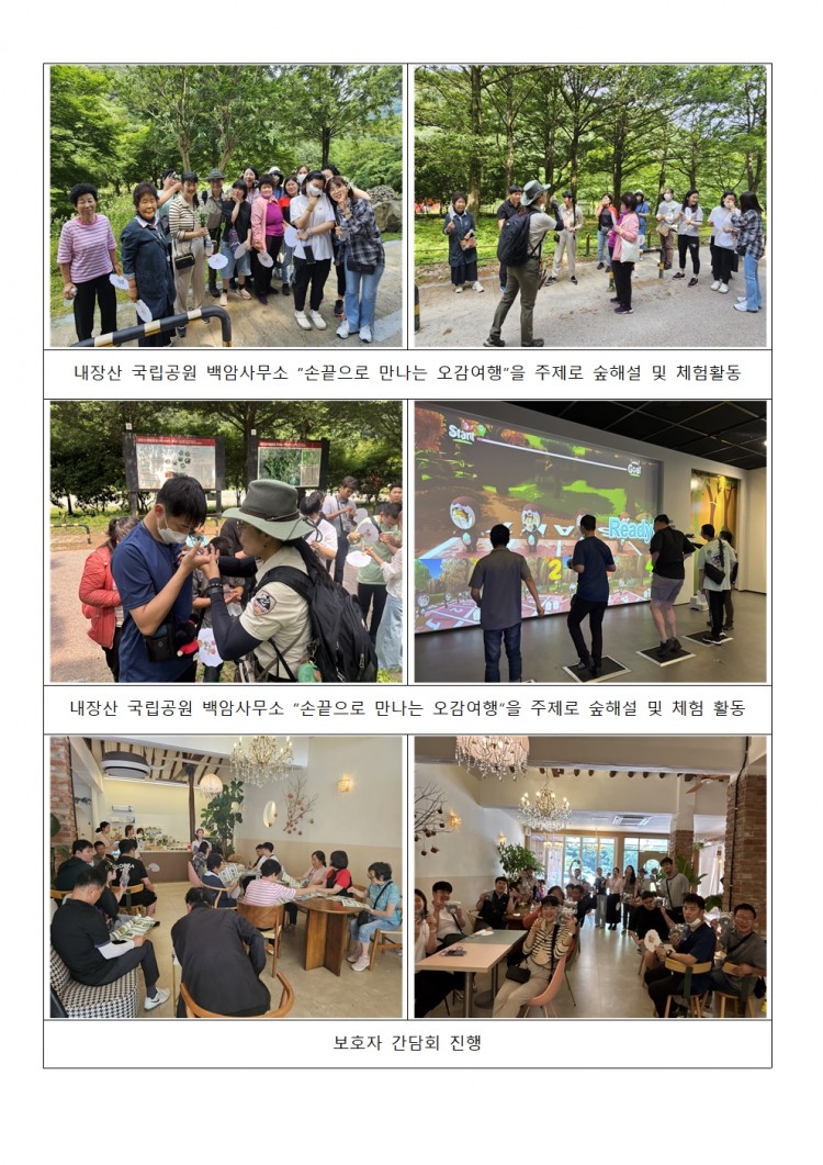 이번 간담회는 내장산 국립공원 백암사무소 “손끝으로 만나는 오감여행”을 주제로 숲해설과 오감을 통해 자연을 느끼는 다채로운 체험 활동으로 구성되었습니다.