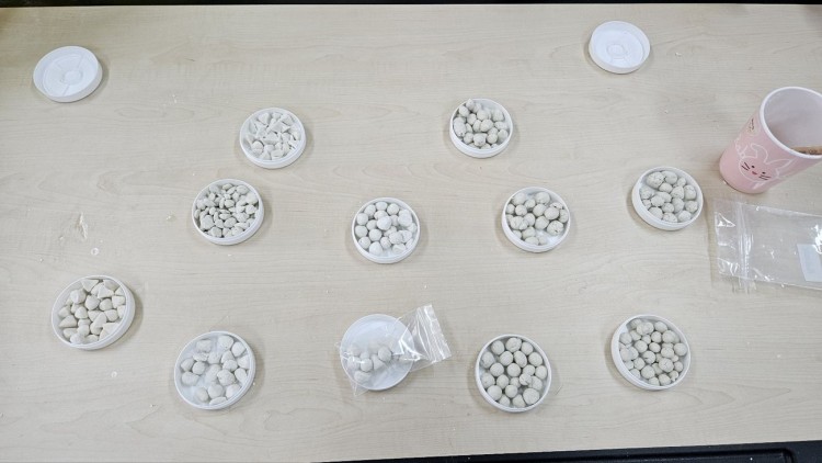 플라스틱 사용 줄이기 활동으로 직접 치약을 오밀조밀하게 꼭꼭 눌러가며 반죽을 한 후 콩알 크기로 일일이 떼어 내어 고체치약이 완성되었습니다. 콩알크기의 치약 만들기가 쉽지는 않았지만 제로웨이스트를 위한 활동으로 집중하여 만들었습니다.