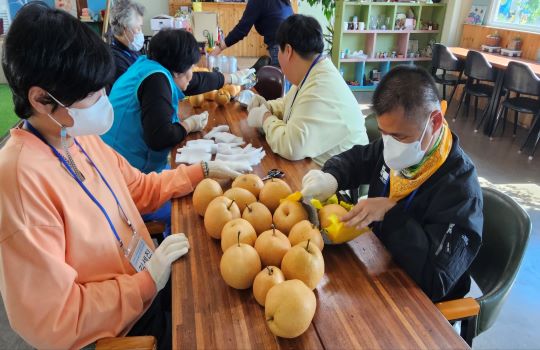 2023년 옐로우창농 농촌자원연계사업으로 우리 복지관 직업적응훈련반, 주간보호반, 마음대움열기 이용자께서 참여하였습니다. 4월부터 10월까지 3개반이 7개월동안 백향과나무 묘목 심고 가꾸기, 다육 식물 심기, 백향과청 만들기, 배 열매 싸주기, 지역농산물로 샌드위치 만들기, 3D펜으로 작품만들기, 오색전부치기, 배 수확해서 포장하기 등 다양한 농촌 활동을 체험하였습니다. 농촌지역에서 다양한 체험활동과 더불어 농산품을 나눔해 주신 옐로우창농에 깊은 감사를 드립니다.