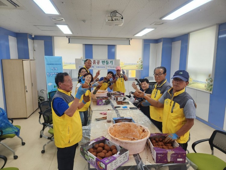 장성군 가을꽃축제기간에 황룡강에 던져지게 될 EM흙공을 우리 장성지킴이단 분들이 동글동글 예쁘게 빚었습니다.