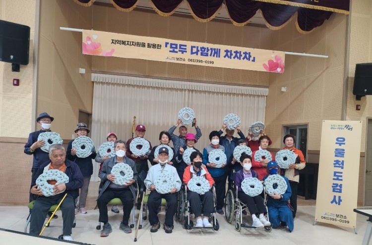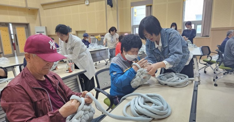 3부에서는 공예요법으로 자이언트얀 방석을 만들었습니다. 손가락의 힘으로 요리조리 꼬아가면서 남녀노소 불문하고 열심히 만들어보고 방석으로 쓸지, 휠체어 등받이로 쓸지 고민하면서 즐거워하는 모습을 보이셨습니다.