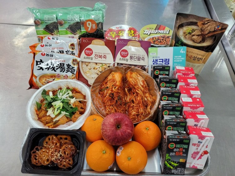 16명: 닭살야채볶음, 연근조림 , 비비고진국설렁탕, 버섯전복죽, 배추김치 , 조미김1묶음, 딸기우유 , 두유, 생크림요거트 1묶음(4개), 오렌지 , 사과 , 안성탕면 3개, 새우탕큰사발, 짜장면큰사발