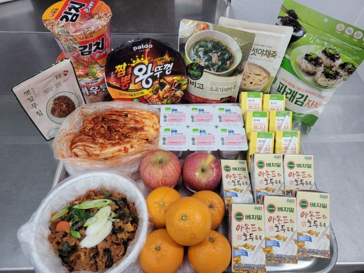 16가정제공:제육볶음 , 쇠고기미역국, 야채죽, 볶음자반, 깻잎무침, 배추김치, 바나나우유 , 베지밀, 요거트 1묶음, 오렌지, 사과