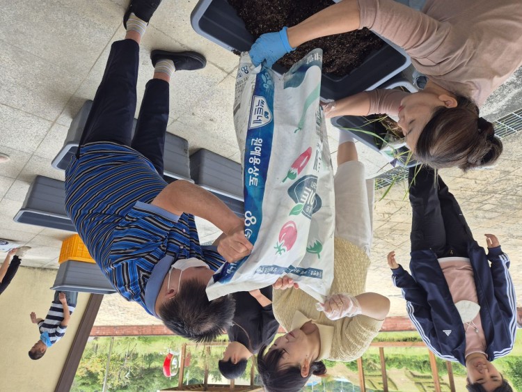 이후에는 밖으로 나가 시금치 씨앗 심기를 하였습니다. 흙을 직접 옮겨 고르게 펴고, 그 위에 씨앗을 뿌리며 정성껏 심어보았는데요. 시간이 지나 자란 시금치로 맛있는 비빔밥을 해먹어 보기로 하였습니다.