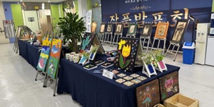 복지관 프로그램에 참여하여 완성된 다양한 작품을 전시하고 모두 관람할 수 있도록 합니다. |